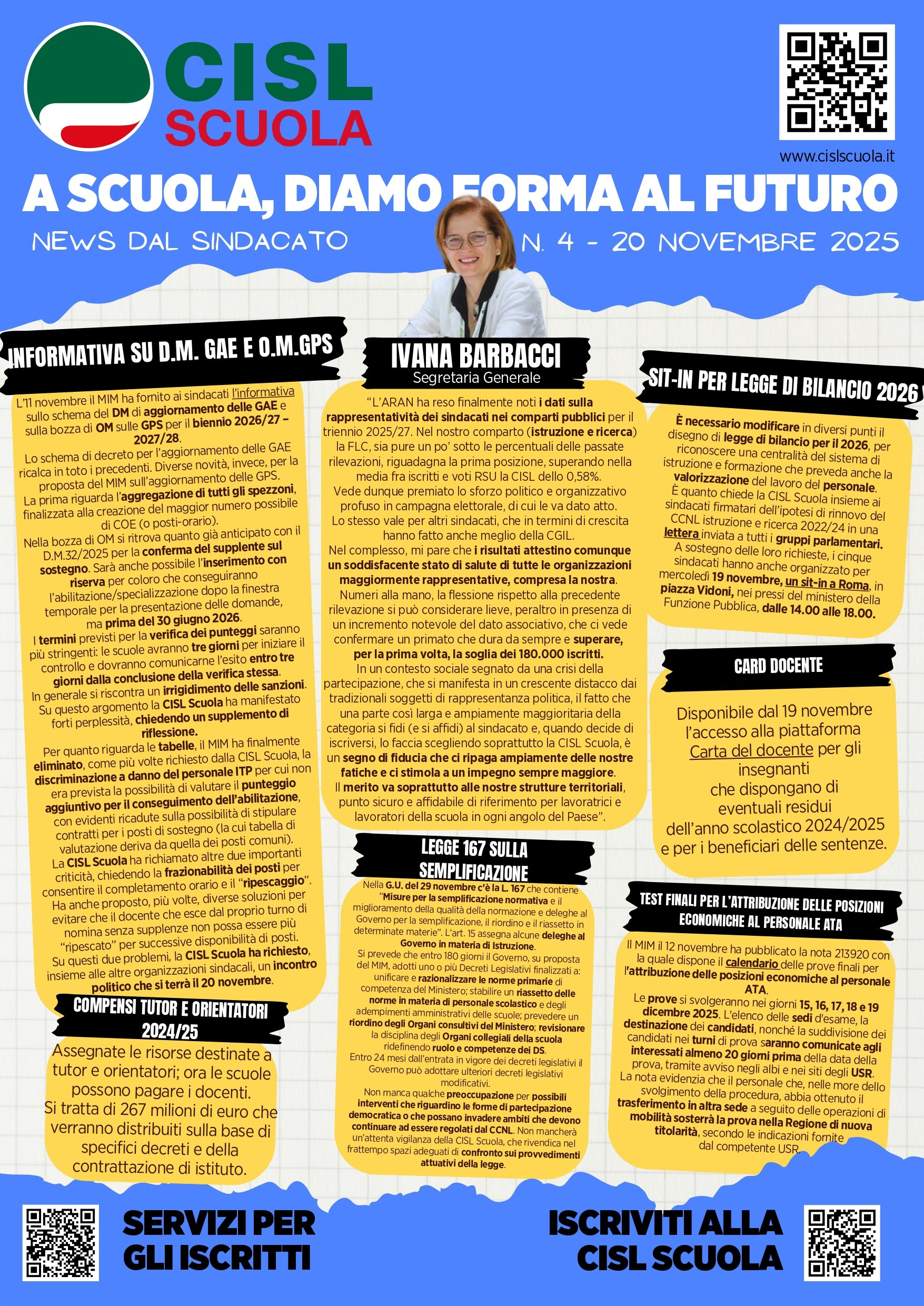 In allegato trovate il numero 4 di novembre 2025 di “A scuola, diamo forma al futuro – News dal sindacato”, la locandina (formato A3) che la segreteria nazionale della CISL Scuola recapita due volte al mese a tutte le istituzioni scolastiche.