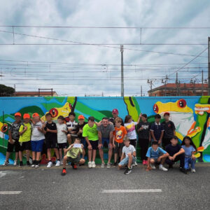 “La classe 5^B Politi in visita al nuovo murale di Jacopo Allegrucci, in via Ponchielli. Un muro di colori, un segno di rinascita, una richiesta di giustizia, nel luogo della strage ferroviaria del 2009”.